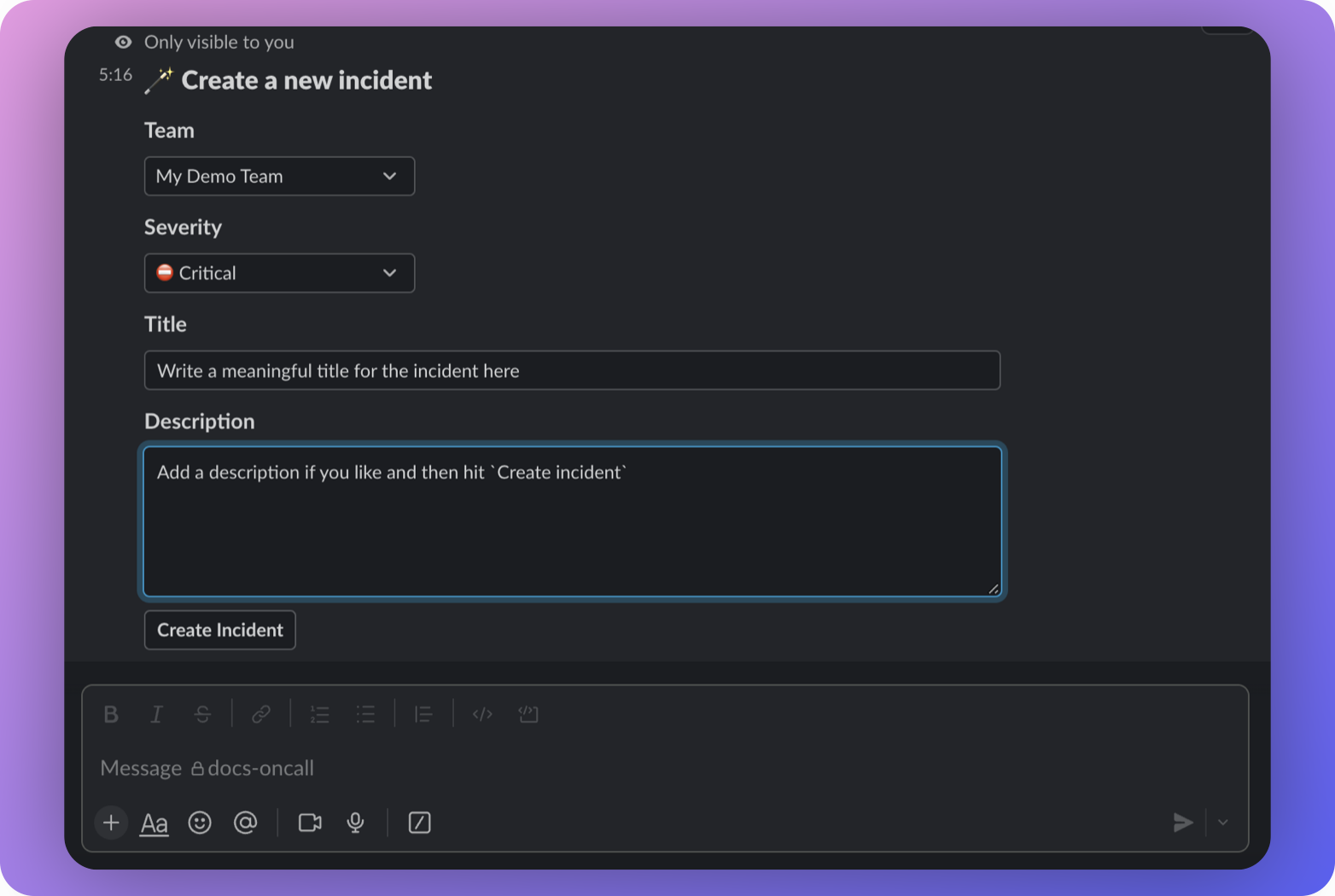 Type in/aq new to trigger an All Quiet incident directly from Slack
