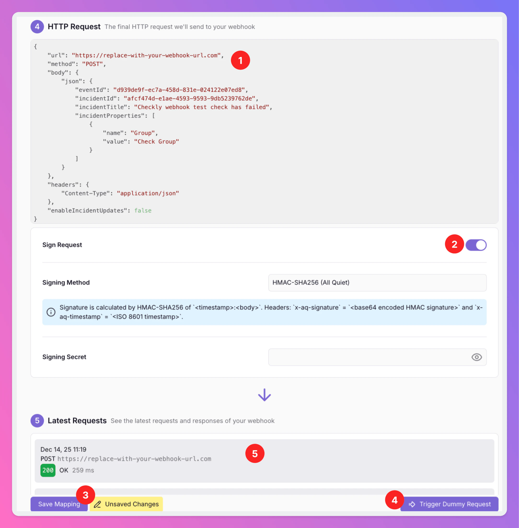 Signing Method, we currently support “HMAC-SHA256 (All Quiet)” or “HMAC-SHA256 (AWS DevOps Agent)”. Don’t forget to add yourSigning Secretwhen adding a signature. - After confirming the request and selected signing method are accurate, save the mapping.