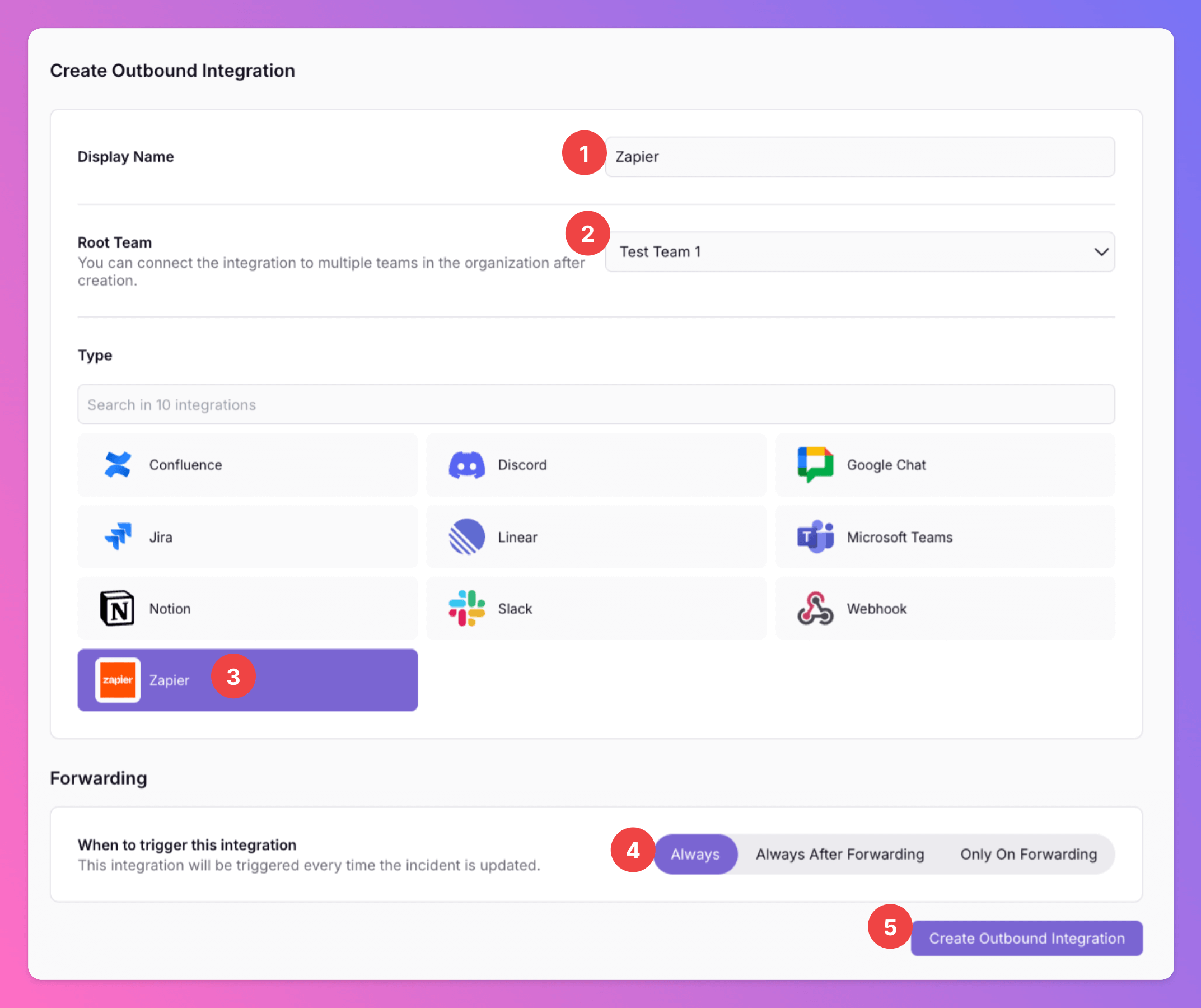 Only On Forwardingwill only forward a snapshot of the current incident history to your Zaps in the moment users manually forward specific incidents or if you set up advanced routing rules for your Zapier Outbound integration that automatically forward incidents in specific scenarios. We will not send any incident updates to your Zaps, afterwards.
