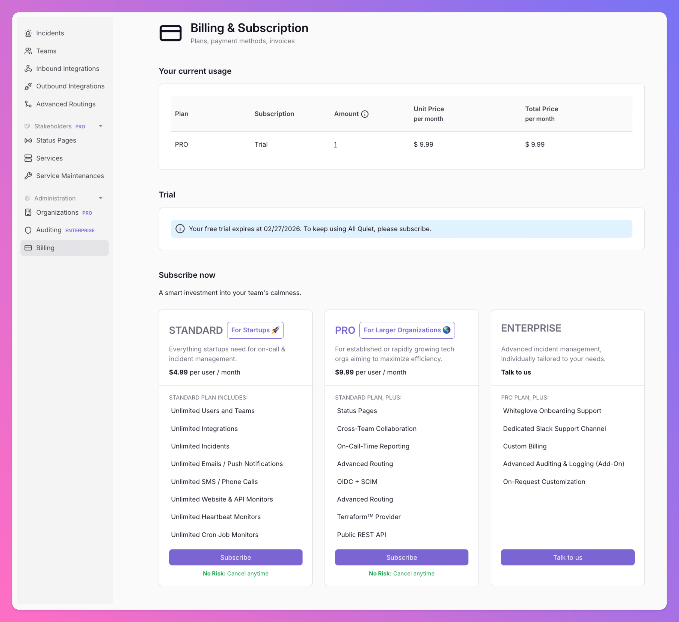 All Quiet offers a free 30-Day trial. No credit card required! After 30 days you need to subscribe to our services to continue using All Quiet effectively. You can subscribe in theBilling section of your dashboard. Select between our three different pricing plans based on your needs.